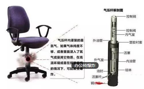这种气压升降椅容易出现爆裂,调节升降时,气压顶杆处可能突然发生爆炸失去控制,指头粗的顶杆瞬间被弹出,山东的一名消费者因此失血过多死亡。