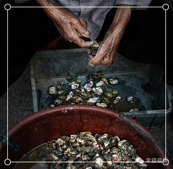 李忠瑞,56岁,讨海时长40年,刚出海归来,正从棚屋内抱出着一捆“挂蛎”,身后还高高堆着一些刚取下运回的海蛎。剥牡蛎肉是渔民家里的女人们经年不息的活计,她们团坐在一起,听她们说一斤新鲜海蛎收购价是30元。剥下的牡蛎肉一部分拿到街上去卖,一部分会有人开着车来买。坐在成堆海蛎壳旁劳作的渔家女人旁,不远处有渔民在织网、挂蛎、修船,海水退潮,一串串挂蛎慢慢地露出水面……