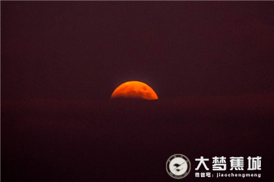19时20分随着雾气消散,最壮观的美景出现了,肉眼明显可见一轮红月高悬空中。
