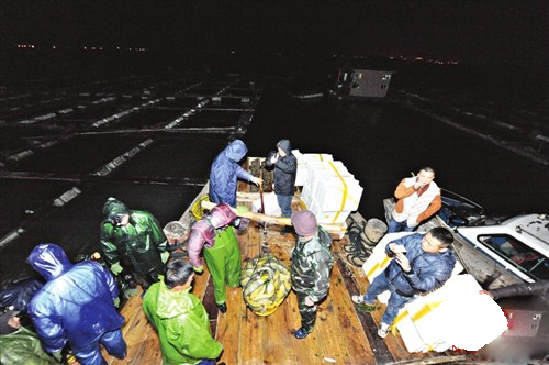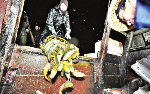 过秤后,渔民把鱼倒入船舱冰鲜