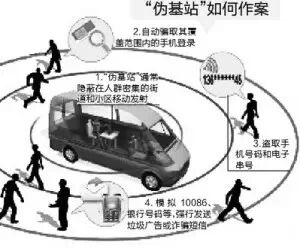 而“伪基站”一般由主机和笔记本电脑组成,可以通过短信群发器等相关设备搜取一定半径范围内的手机卡信息,然后伪装成银行、政府机关、运营商、亲友等任意号码,强行向用户手机发送诈骗短信。诈骗分子通常将“伪基站”隐蔽在车站、居民小区等人群密集的场所移动发射,以提高目标对象的数量。为了增强欺骗性,诈骗分子甚至还会把发射场所选择在银行附近,因为选择在银行门口发送,许多人在银行办理业务时往往会造成误会,给骗子可乘之机。