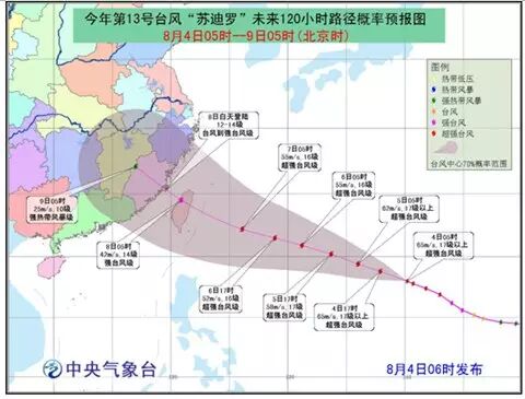 预计,“苏迪罗”将以每小时20公里左右的速度向西偏北方向移动,24小时之内强度维持,尔后缓慢减弱。7日夜间,“苏迪罗”将登陆或擦过台湾东北部沿海,8日白天逐渐向浙闽一带沿海靠近。
