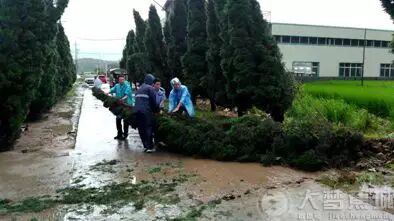 9日9时,赤溪派出所民警在巡查中发现桃源村园区路段多棵树被台风吹倒阻断交通,民警齐力清理障碍恢复交通。