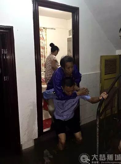 8日23时,东湖路东湖弄一民房被水淹,蕉南派出所民警将受困群众背至安置点。