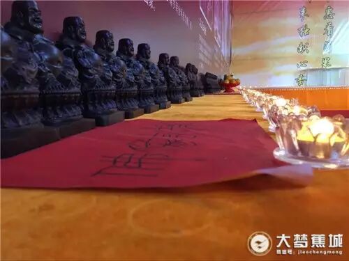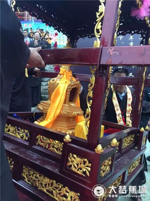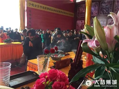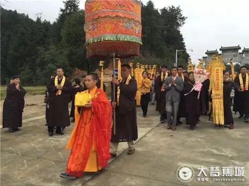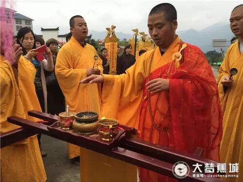 大雄宝门前排着两道长长的护送队伍,他们身披海青手持金色的吊炉、红色的灯笼、黄色的宝盖......虔诚护送释迦牟尼佛金身。