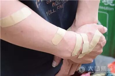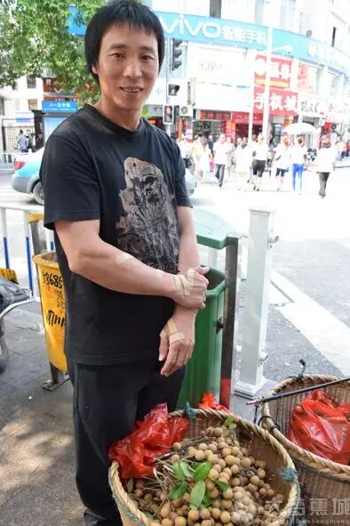 在菊池商厦的十字口附近,周云建如往常般地挑着两担新鲜的龙眼叫卖。唯一不同的是,他双臂上多了数十个创可贴,横七竖八,看起来十分有个性。
