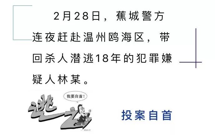 案发后,犯罪嫌疑人林某潜逃,从此销声匿迹。18年来,蕉城警方一直没有放弃对林某的追捕劝逃工作。虎贝派出所民警经常走访林某家属,宣讲投案自首的相关政策,劝导其家属配合公安机关工作。