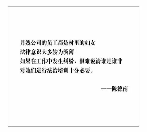 对他一手组建起来的前路家政月嫂服务中心,这种法治扶贫的理念尤为深入。为了落实精准扶贫保障妇女儿童权益,在月嫂公司成立之初,他便邀请蕉城区检察院负责未成年人犯罪检察工作的干警,多次开展专题讲座活动。