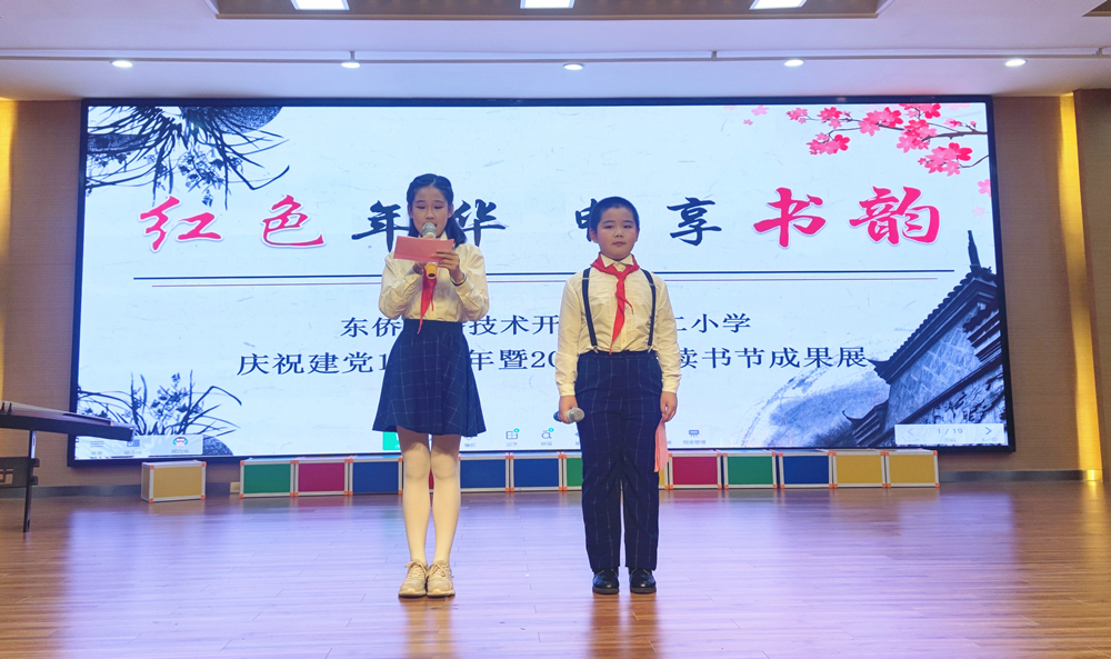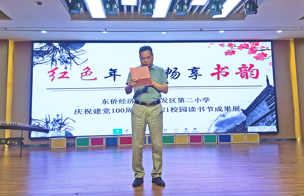 “红军不怕远征难,万水千山只等闲......”5月28日下午,“红色年华·畅享书韵”--东侨经济技术开发区第二小学庆祝建党100周年暨2021年校园读书节成果展示活动在学校多功能厅开展,阵阵读诗声飘出展厅。