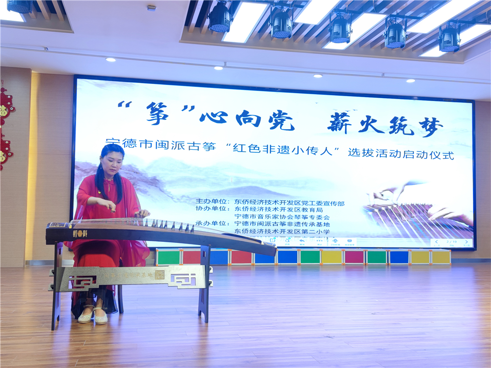 活动现场邀请了宁德市闽派古筝演奏技艺非遗代表性传承人、宁德市音协琴筝专委会会长、东侨音乐家协会主席吕田田老师。在成果展节目表演正式开始之前,吕老师给大家分享闽筝非遗红色文化,表演了古筝伴奏诗朗诵,引领在场的师生家长齐唱红歌《唱支山歌给党听》,展示了闽筝的独特魅力。